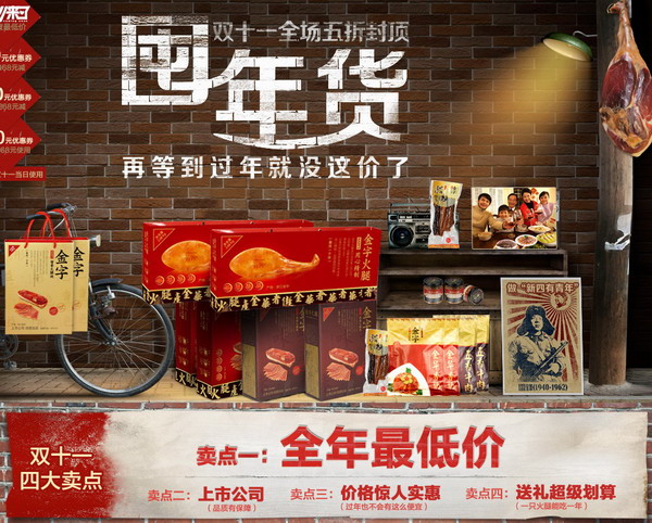 11月14日,在淘寶轟轟烈烈的雙十一活動(dòng)三天之后,金字火腿的工作人員終于把最后一批打包好的活動(dòng)商品搬到快遞公司的車輛上。與此同時(shí),淘寶雙十一火腿類目排行榜出爐,金字火腿毫無懸念?yuàn)Z得銷售冠軍。