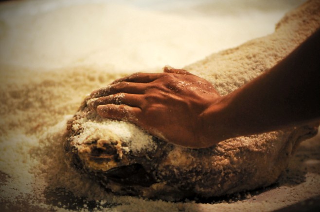 腌制火腿要使用大量的鹽,鹽并不是一次性倒入到火腿當(dāng)中的,而是要將鹽均勻地涂抹到肉腿上面。涂也不是一次性就能涂抹好,每條腿可能都要經(jīng)歷6—7次“美膚”和“按摩”的過(guò)程,最終表面結(jié)成白色的鹽霜,肌肉變得堅(jiān)硬緊實(shí)了才算可以了。第一次抹鹽叫做“上小鹽”,就是先將薄鹽抹在豬腿的表面,然后腌制一晚。第二次抹鹽叫做“上大鹽”,是在“上小鹽”的次日,這次要先將腌制出的血水用手?jǐn)D出,之后再均勻地涂上新的鹽。之后的上鹽均是在肉質(zhì)比較肥厚和筋骨相連的地方著重補(bǔ)鹽,時(shí)間則是在第7天、第13天、第27天。經(jīng)過(guò)這些次的鹽腌,整條豬腿均被食鹽腌透浸滿,腌的時(shí)候碼放也是有講究的,皮朝下肉朝上,最后一層則是皮朝上的。