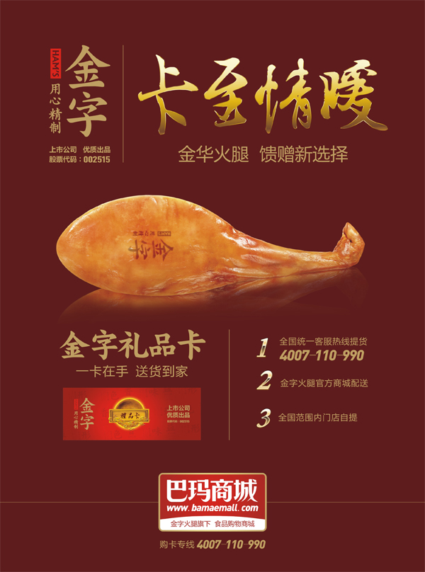 作為一家上市公司——金字火腿推出的禮品卡,禮品卡多年信譽,廣受消費者的真心歡迎,每年回頭客無數,而更重要的是,金字每年把產品的品質和備貨做到更好,禮品卡內產品都是公司層層品質歷練的熱銷產品,用火腿、臘肉、香腸這些實在心意,去感動每一位朋友。如今,更是可以通過手機微信關注金字火腿,盡享中華美食同時,與朋友分享禮品卡里所蘊含的真情實意。