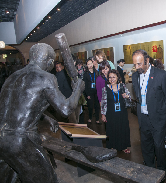 從一進中國火腿博覽館的大門開始,使節們就被眼前精美的浮雕所吸引。透過金字火腿吳月肖副總經理有趣的解說和翻譯的詳盡翻譯,50余人才搞明白:原來這就是著名的《百姓勞軍圖》,而使節中的一些“中國通”發現他們熟知岳飛的師傅宗澤,原來竟然是金華火腿的祖師爺,火腿原料金華兩頭烏如此有趣珍貴,就好比中國的熊貓。